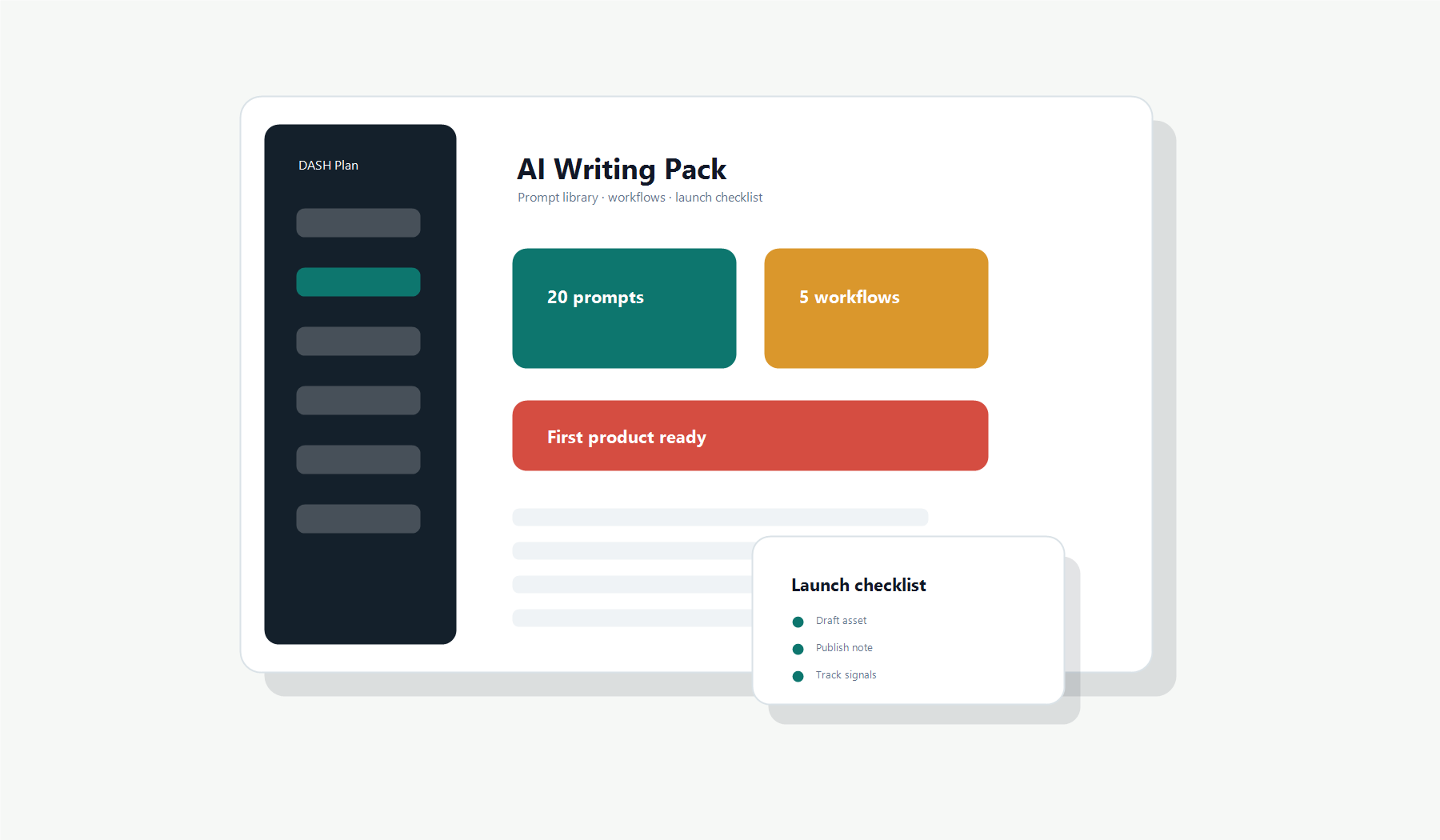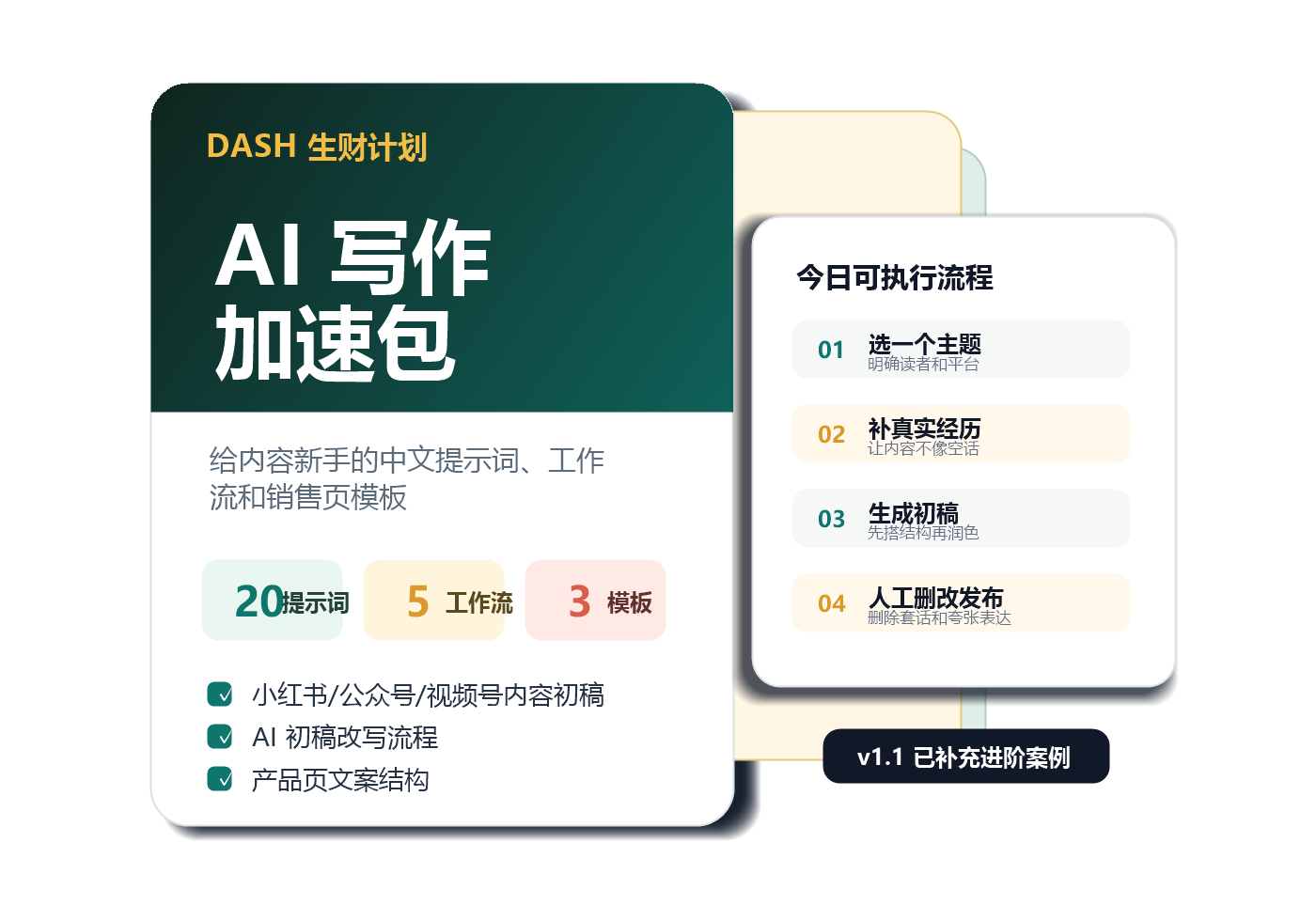 DASH 生财计划先聚焦一个明确场景:用 AI 更快完成中文内容初稿、产品介绍和发布前检查。根据首批用户反馈,资料包已补充进阶案例和可执行练习路线。